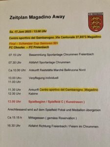 Am Samstag ziehen die Freienbacher Senioren 50+ ins Tessin, nach Magadino, an den Schweizer Cup Final. Gegner ist der FC Choulex aus Genf. Um 13.00 Uhr startet dann das Finalspiel.